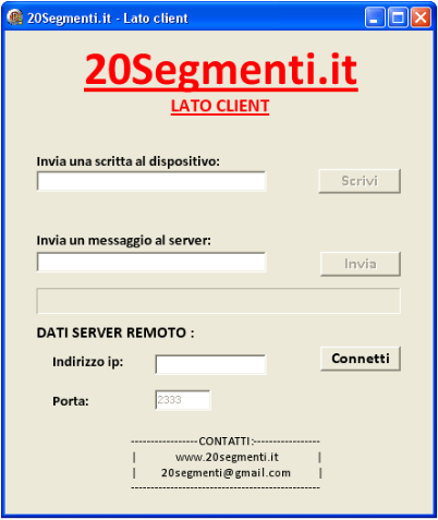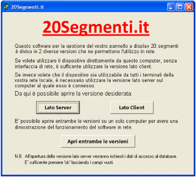 Questa è la prima interfaccia che vi si presenterà all' avvio del programma di 20Segmenti.it . Con questa form vengono fornite alcune istruzioni per il corretto utilizzo delle diverse versioni, ed e' possibile aprire la versione desiderata per l'utilizzo che si intende fare del pannello.E' anche possibile aprire entrambe le versioni sullo stesso computer per avere una dimostrazione del funzionamento del collegamento client / server.
