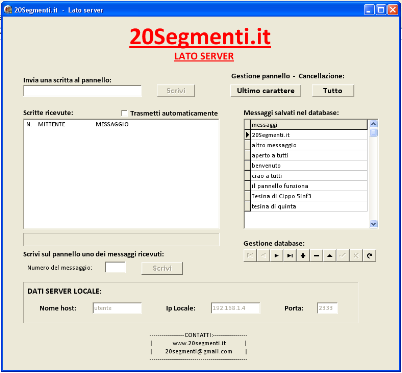 L'interfaccia della versione server e' sicuramente la più completa ed elaborata. Con questa versione e' possibile scrivere sul pannello a display prendendo i dati da diverse fonti. E' possibile inviare direttamente un messaggio al dispositivo, oppure lasciare che siano i client della rete a gestire la scritta sui display. Per permettere ai client di collegarsi alla versione server, è sufficiente comunicargli l'indirizzo ip del proprio computer, che viene rilevato automaticamente dal programma. Tutti i messaggi inviati dai client vengono salvati e mostrati a video, e grazie ad un numero identificativo e' possibile utilizzarli in qualsiasi momento. Inoltre e' possibile memorizzare in un database i messaggi utilizzati frequentemente per averli sempre pronti ad ogni utilizzo. La versione server consente anche di inviare speciali segnali al dispositivo per cancellare l’intera scritta, o solo l’ultimo carattere trasmesso al pannello. Quest’ultima funzione può rivelarsi molto utile se bisogna solo aggiornare una parte del messaggio senza riscriverlo interamente.