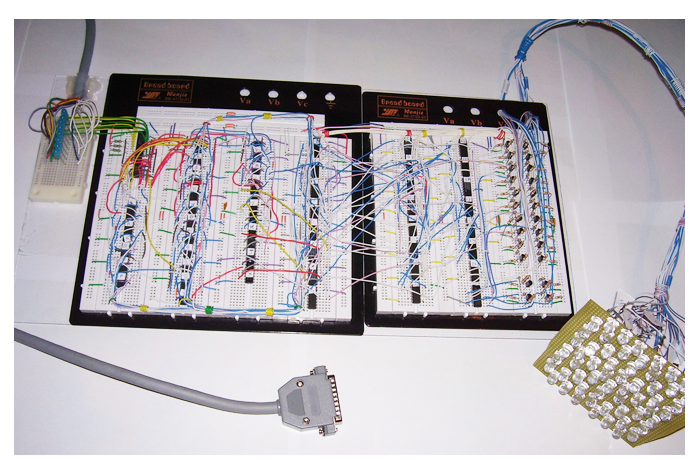 È formato da 45 componenti attivi, 24 transistor BC546, oltre 50 metri di cavo da breadboard, un cavo con porta parallela, 64 led ed un centinaio di resistenze. A causa del grande numero di collegamenti necessari, sono stato costretto a tagliare un tratto di filo della lunghezza adatta ad ognuno, per evitare che il circuito venisse coperto da centinaia di fili volanti.