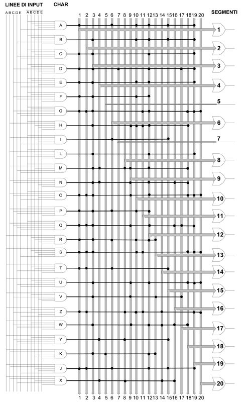 Ho organizzato questo schema logico in forma di tabella per renderne comprensibile il funzionamento. Sulla sinistra è possibile vedere le 26 porte AND che riconoscono le diverse combinazioni degli ingressi, identificando il carattere.