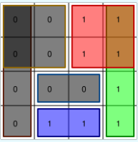 Qui a fianco viene mostrata una mappa in cui sono stati evidenziati tutti i raggruppamenti possibili di 1, ossia di uscita logica attiva. I gruppi devono avere un numero di elementi pari a una potenza di 2. È necessario compiere uno studio di questo tipo, con una o più mappe, per ogni uscita del circuito.
