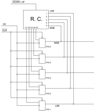 Questo circuito implementa un contatore UP / DOWN sincrono di 5 bit, con funzione di Clear.